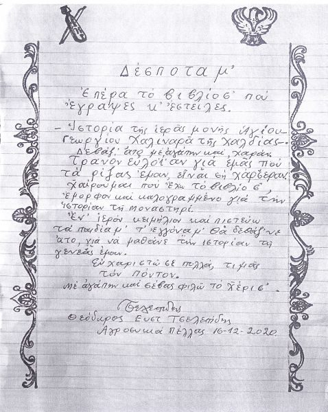 Ενδεικτικό της ξεχωριστής αυτής προσφοράς του βιβλίου του Σεβ. κ. Παύλου παραμένει η συγκινητική από μέσης καρδίας ιδιόχειρη επιστολή στην ποντιακή διάλεκτο του κ. Θεοδώρου Ευστ. Τσελεπίδη από την Αγροσυκιά Ν. Πέλλας (16/12/2020) με καταγωγή από την μαρτυρική Χάρσερα του Πόντου, την οποία δημοσιεύουμε.