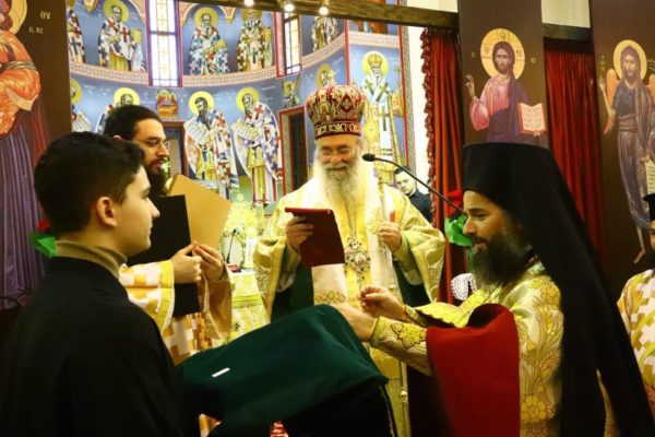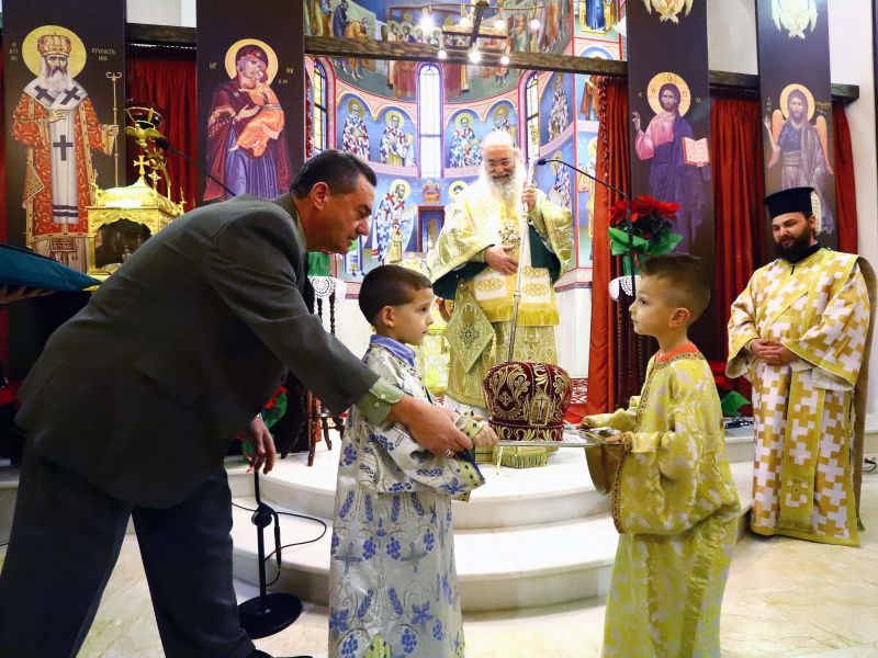 Αποκορύφωμα αυτής της λειτουργικής και λατρευτικής πανδαισίας ήταν η στιγμή που οι ιερόπαιδες του Ναού με μπροστάρηδες τους δύο νεώτερους, τους πεντάχρονους Ιωάννη και Χαράλαμπο, σε ανάμνηση της αφίξεώς του στην ενορία προσέφεραν ως δώρο στον Ποιμενάρχη τους μία αρχιερατική μίτρα για να την φοράει στη Θεία Λειτουργία και να μνημονεύει τους Ενορίτες του Αγίου Χρυσοστόμου και ιδιαίτερα τα παιδιά που τόσο αγαπά. Την προσέφεραν ως ένδειξη της υιικής τους αγάπης, ως ένδειξη τιμής και αφοσιώσεως.