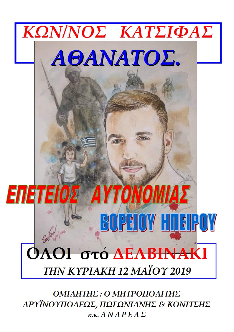 – Δ -Γι’ αὐτό, ἡ ἀκριτικὴ Μητρόπολή μας, συνεχίζοντας τὸ ἔργο καὶ τὴν ἐθνικὴ καὶ χριστιανικὴ προσπάθεια τοῦ ἀοιδίμου Μεγάλου Ἱεράρχου ΣΕΒΑΣΤΙΑΝΟΥ, ὀργανώνει καὶ φέτος τὶς ἐκδηλώσεις γιὰ τὴν Βόρειο Ἤπειρο, 12 Μαΐου 2019, στὸ ἡρωϊκὸ Δελβινάκι. Θὰ τελεσθῇ ἡ Θεία Λειτουργία καὶ τὸ Μνημόσυνο τῶν πρωτεργατῶν τῆς Αὐτονομίας (1914), καθὼς καὶ τοῦ Κωνσταντίνου Κατσίφα. Ὕστερα θὰ κατατεθῇ στεφάνι στὸν τάφο τοῦ ἀοιδίμου Μητροπολίτου Δρυϊνουπόλεως Βασιλείου καί, ἀμέσως μετά, θὰ ἀκολουθήσῃ ἡ ὁμιλία τοῦ Μητροπολίτου κ. ΑΝΔΡΕΟΥ. Ἡ ἐκδήλωση θὰ κλείσῃ μὲ τὴν εἰρηνικὴ πορεία μέχρι τὸ Ἡρῶον, ὅπου θὰ ἀναγνωσθῆ σχετικὸ Ψήφισμα καὶ θὰ ψαλῇ ὁ Ἐθνικός μας Ὕμνος. Σᾶς περιμένω ὅλους, Ἑλλαδῖτες καὶ Βορειοηπειρῶτες γιὰ νὰ διακηρύξουμε τὴν θέλησή μας γιὰ τὴν Ἕνωση τῆς Βορείου Ἠπείρου μὲ τὴν Ἑλλάδα.