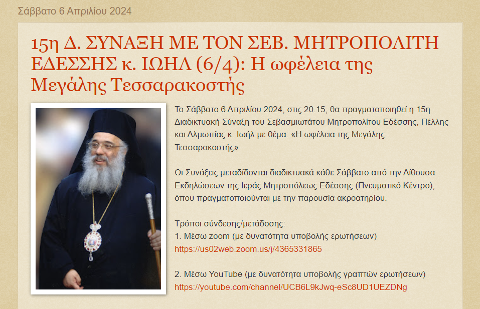 Το Σάββατο 6 Απριλίου 2024, στις 20.15, θα πραγματοποιηθεί η 15η Διαδικτυακή Σύναξη του Σεβασμιωτάτου Μητροπολίτη Εδέσσης, Πέλλης και Αλμωπίας κ. Ιωήλ με θέμα: «Η ωφέλεια της Μεγάλης Τεσσαρακοστής».