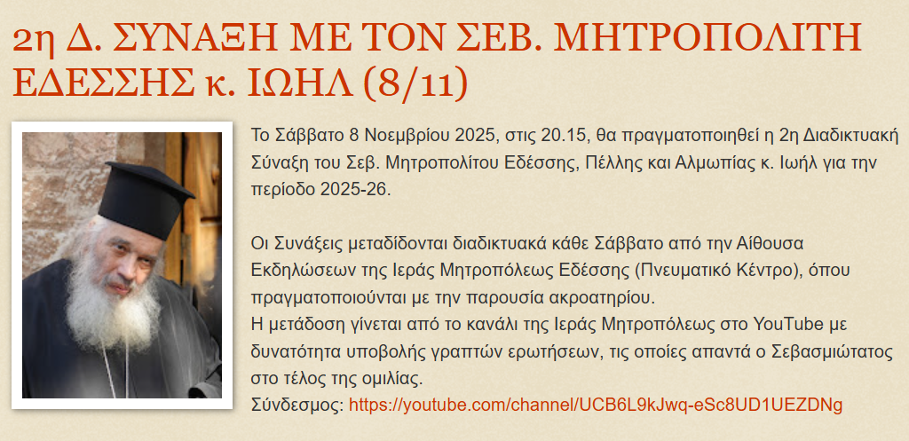 Το Σάββατο 8 Νοεμβρίου 2025, στις 20.15, θα πραγματοποιηθεί η 2η Διαδικτυακή Σύναξη του Σεβ. Μητροπολίτου Εδέσσης, Πέλλης και Αλμωπίας κ. Ιωήλ για την περίοδο 2025-26.