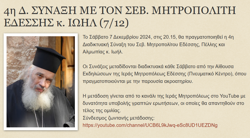 Το Σάββατο 7 Δεκεμβρίου 2024, στις 20.15, θα πραγματοποιηθεί η 4η Διαδικτυακή Σύναξη του Σεβ. Μητροπολίτου Εδέσσης, Πέλλης και Αλμωπίας κ. Ιωήλ.
