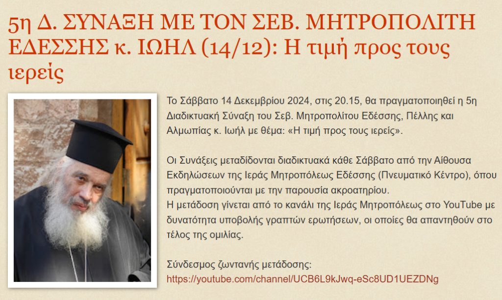Το Σάββατο 14 Δεκεμβρίου, στις 20.15, θα πραγματοποιηθεί η 5η Διαδικτυακή Σύναξη του Σεβ. Μητροπολίτου Εδέσσης, Πέλλης και Αλμωπίας κ. Ιωήλ με θέμα: «Η τιμή προς τους ιερείς».