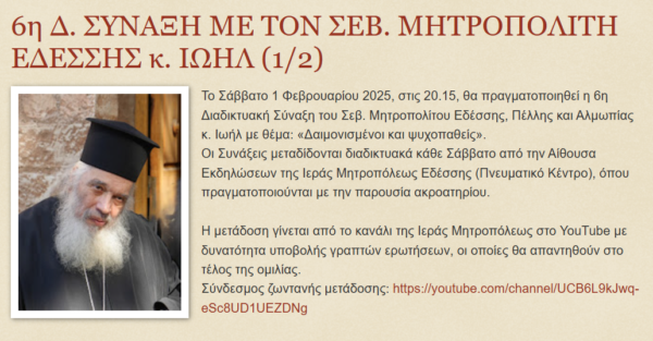 Το Σάββατο 1 Φεβρουαρίου 2025, στις 20.15, θα πραγματοποιηθεί η 6η Διαδικτυακή Σύναξη του Σεβ. Μητροπολίτου Εδέσσης, Πέλλης και Αλμωπίας κ. Ιωήλ με θέμα: «Δαιμονισμένοι και ψυχοπαθείς».