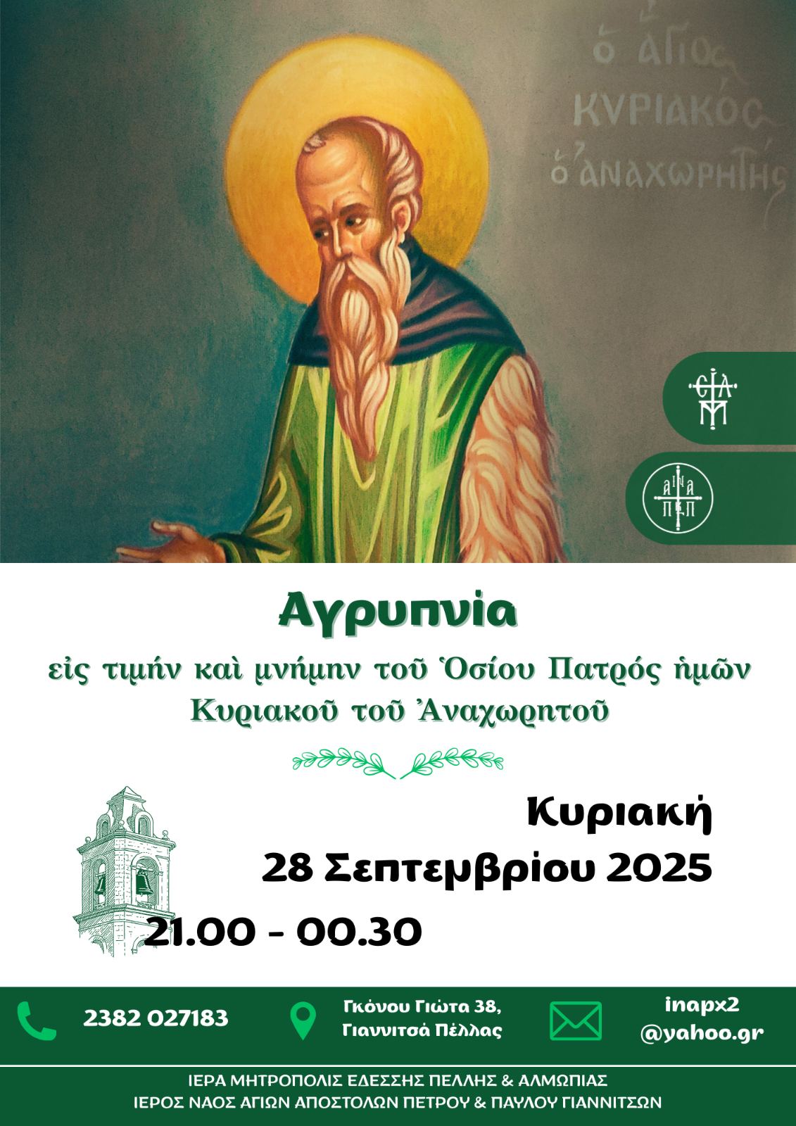 Την Κυριακή 28 Σεπτεμβρίου από ώρα 9.00 μ.μ. έως 12.30 π.μ. στον ιερό ενοριακό ναό Αγίων Αποστόλων Πέτρου και Παύλου Γιαννιτσών θα τελεσθεί ιερά Αγρυπνία για την εορτή του οσίου και θεοφόρου Πατρός Κυριακού του Αναχωρητού.