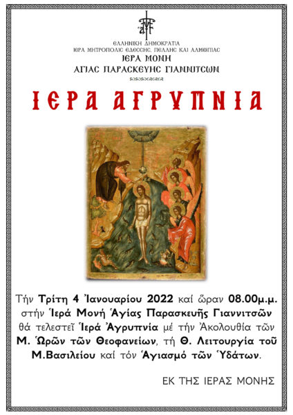 Στην Ιερά Μονή Αγίας Παρασκευής Γιαννιτσών θα τελεσθεί ιερά Αγρυπνία με την Ακολουθία των Μεγάλων Ωρών, τον Εσπερινό των Θεοφανείων συνημμένο με την Θεία Λειτουργία του Μ. Βασιλείου και τον Μεγάλο Αγιασμό, σήμερα Τρίτη 4 Ιανουαρίου 2022 και ώρα 8.00 μ.μ.