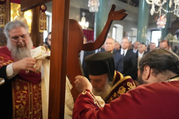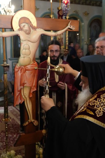 Χρησιμοποίησε μάλιστα συγκεκριμένα αγιογραφικά παραδείγματα ο Σεβασμιώτατος για να δείξει ότι ο Σταυρός αποτελεί πλέον τίτλο τιμής και καύχημα των πιστών. Και εμείς όλοι, κατέληξε, για να είμαστε μαθητές του Χριστού, πρέπει να άρουμε τον σταυρό μας. Ο σταυρός ενός ανθρώπου μπορεί να είναι μια αρρώστια σωματική ή μια ψυχική αρρώστια, η αμαρτία, ή άλλα πράγματα, όπως η περιφρόνηση των άλλων, η οδύνη κ.λπ. Αυτόν τον σταυρό πρέπει να τον φέρουμε με πόθο, χωρίς να διαμαρτυρόμαστε στον Θεό. Σήμερα που έχουμε πολλές ανάγκες και μας απειλούν πολλοί κίνδυνοι -και την πατρίδα μας και εμάς προσωπικά- πρέπει να στηριχθούμε στον Σταυρό του Κυρίου που είναι ανίκητος.