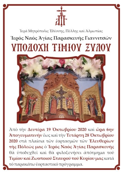 Από την Δευτέρα 19 Οκτωβρίου 2020 και ώρα 6.00 μ.μ. έως και την Τετάρτη 28 Οκτωβρίου στα πλαίσια των εορτασμών των Ελευθερίων των Γιαννιτσών ο Ιερός Ναός Αγίας Παρασκευής της Ιεράς Μητροπόλεως Εδέσσης, Πέλλης και Αλμωπίας θα υποδεχθεί και θα φιλοξενήσει απότμημα του Τιμίου και Ζωοποιού Σταυρού.