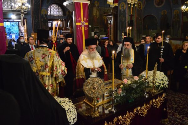 Κατέληξε δε τονίζοντας με συγκίνηση, ότι ο Άγιος είναι ολοζώντανος· κατοικεί στην όντως πατρίδα μας, που είναι ο Ουρανός, και μέσα από τα γεγονότα βεβαιώνει ότι ζει και μας συντρέχει στις διάφορες περιστάσεις και ανάγκες του βίου μας.