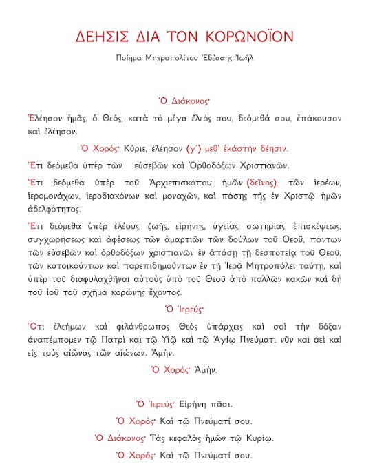 1. Πλήρη δέηση για την πανδημία του Κορωνοϊού, η οποία περιλαμβάνει και την ειδική ευχή που συνέθεσε από την έναρξη της λοιμικής επιδημίας. Η δέησις μπορεί να αναπέμπεται είτε στο τέλος της Θείας Λειτουργίας και άλλων ιερών ακολουθιών είτε αυτοτελώς.