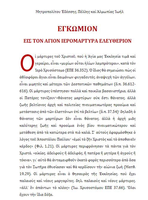 2. Εγκώμιο εις τον Άγιο Ιερομάρτυρα Ελευθέριο, το οποίο συνέγραψε ο Σεβασμιώτατος μετά από αίτημα της ιεράς συνοδείας της καλύβης του Αγ. Ελευθερίου Βουλευτηρίων της Ιεράς Σκήτης της Αγίας Άννης Αγίου Όρους.