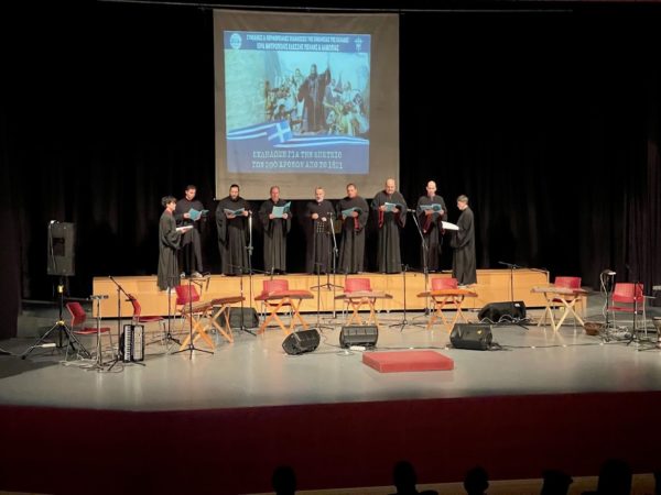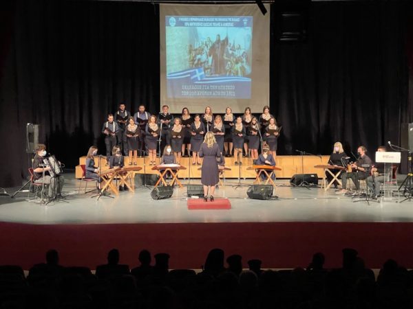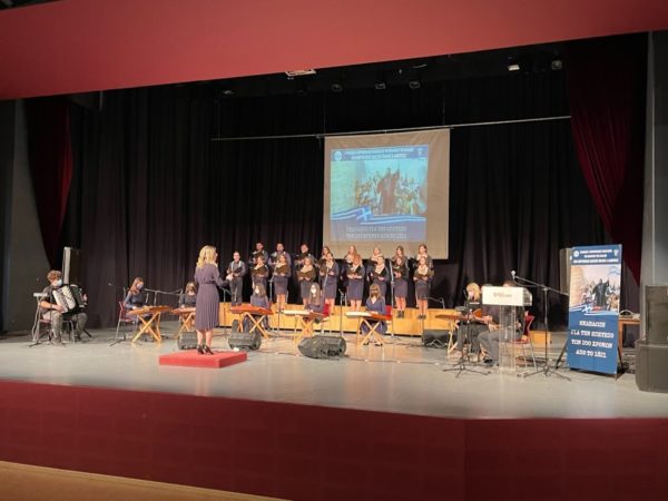 Στην συνέχεια η χορωδία «ΕΝ-ΕΙΤΕ» της ενορίας Αγίου Γεωργίου Γιαννιτσών απέδωσε με την συνοδεία οργάνων πατριωτικά και παραδοσιακά τραγούδια, τα οποία διασκεύασε και διηύθυνε η κ. Σοφία Ηλιάδου, απόφοιτος του τμήματος Λαϊκής και Παραδοσιακής Μουσικής της Σχολής Καλλιτεχνικών Σπουδών Ηπείρου.