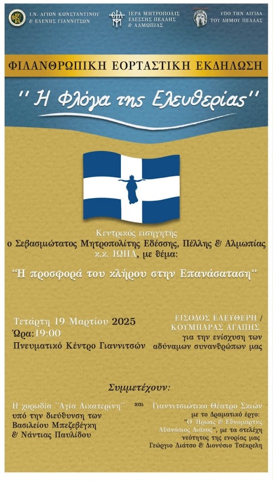 Με μεγάλη επιτυχία και πολυπληθές ακροατήριο πραγματοποιήθηκε η Επετειακή Φιλανθρωπική Εκδήλωση του Ιερού Ναού Αγίων Κωνσταντίνου και Ελένης Γιαννιτσών στον Πνευματικό Κέντρο του Δήμου Πέλλας την Τετάρτη 19 Μαρτίου 2025.
