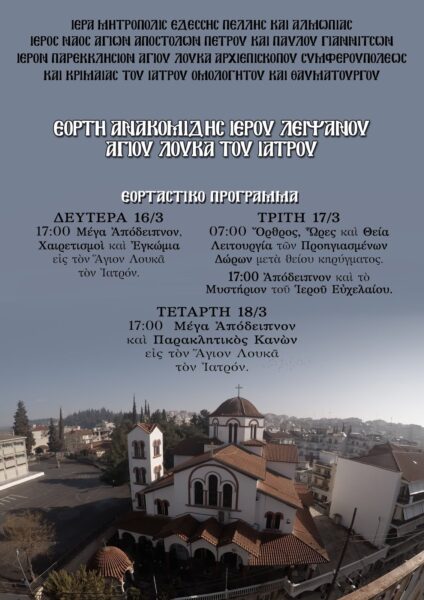 Την Τρίτη 17 Μαρτίου 2020, εορτή της ανακομιδής του ιερού Λειψάνου του εν αγίοις πατρός ημών Λουκά Αρχιεπισκόπου Συμφερουπόλεως και Κριμαίας του Ιατρού και Ομολογητού, πανηγυρίζει το φερώνυμο ιερό παρεκκλήσιο του Ιερού Ναού Αγίων Αποστόλων Πέτρου και Παύλου Γιαννιτσών, σύμφωνα με το εξής πρόγραμμα:
