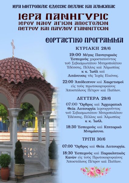 7.00 μ.μ. Μέγας Αρχιερατικός Εσπερινός χοροστατούντος του Σεβ. Μητροπολίτου Εδέσσης, Πέλλης και Αλμωπίας κ.κ. Ιωήλ. Στη συνέχεια θα γίνει η λιτάνευση της ιεράς εικόνος των Αγίων Αποστόλων πολιούχων της πόλεως πέριξ του Ιερού Ναού.