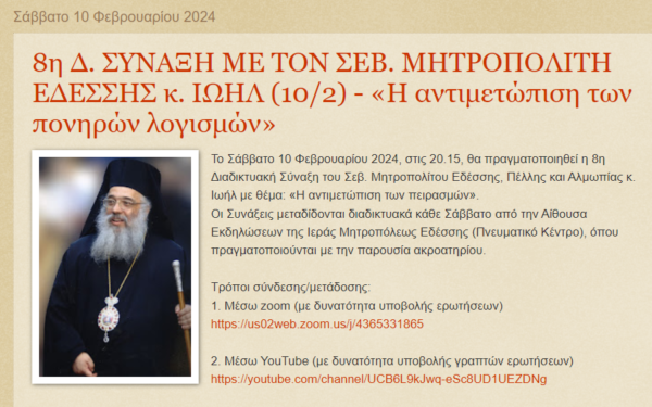 Η 8η Διαδικτυακή Σύναξη του Σεβασμιωτάτου Μητροπολίτη Εδέσσης, Πέλλης και Αλμωπίας κ. Ιωήλ με θέμα: «Η αντιμετώπιση των πειρασμών» θα πραγματοποιηθεί σήμερα στις 20.15.
