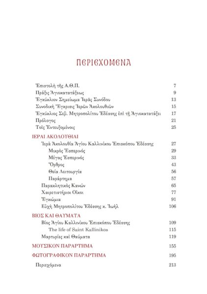 Πρόκειται για την πλήρη Ακολουθία του προσφάτως αγιοκαταταχθέντος (23.6.2020) Αγίου Καλλινίκου Επισκόπου Εδέσσης καθώς και τις ακολουθίες του Παρακλητικού Κανόνος, των Χαιρετισμών και των Εγκωμίων καθώς επίσης και ειδικής Ευχής, ποιήματα του Σεβ. Μητροπολίτου Εδέσσης, Πέλλης και Αλμωπίας κ. Ιωήλ.