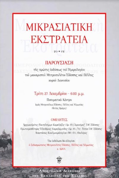 Την Τρίτη 27 Δεκεμβρίου 2022, στις 18.00, θα πραγματοποιηθεί η επίσημη Παρουσίαση του προσωπικού Ημερολογίου του μακαριστού Μητροπολίτου Εδέσσης και Πέλλης κυρού Διονυσίου από την συμμετοχή του στην Μικρασιατική Εκστρατεία (24.9.1920-31.12.1921), το οποίο εκδόθηκε από την Αποστολική Διακονία της Εκκλησίας της Ελλάδος.