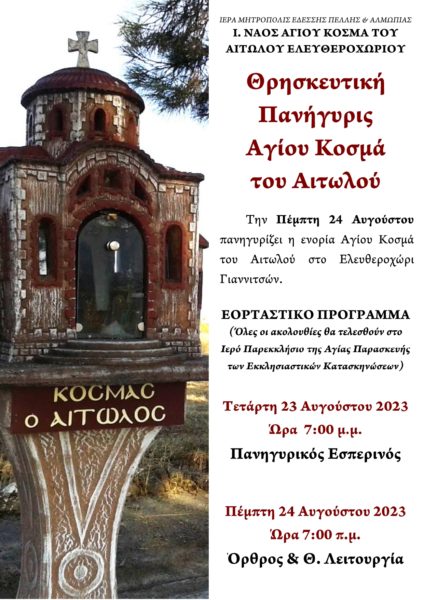 20/08/2023 20/08/2023 Την Πέμπτη 24 Αυγούστου πανηγυρίζει η ενορία Αγίου Κοσμά του Αιτωλού στο Ελευθεροχώρι Γιαννιτσών. ΕΟΡΤΑΣΤΙΚΟ ΠΡΟΓΡΑΜΜΑ Τετάρτη 23/8 7:00 μ.μ. Πανηγυρικός Εσπερινός Πέμπτη 24/8 7:00 π.μ. Όρθρος & Θ. Λειτουργία Όλες οι ιερές ακολουθίες θα τελεσθούν στο Ι. Παρεκκλήσιο της Αγίας Παρασκευής των Εκκλησιαστικών Κατασκηνώσεων.