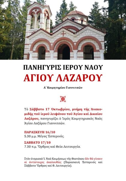 Πανηγυρίζει αύριο, Σάββατο 17 Οκτωβρίου, ο Ιερός Κοιμητηριακός Ναός Αγίου Λαζάρου Γιαννιτσών επί τη μνήμη της Ανακομιδής του ιερού λειψάνου του Αγίου και Δικαίου Λαζάρου. Απόψε τελέστηκε ο Μέγας Πανηγυρικός Εσπερινός, ενώ αύριο το πρωί (17/10) θα τελεστεί ο Όρθρος και η Πανηγυρική Θεία Λειτουργία.