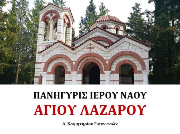 Πανηγυρίζει αύριο, Σάββατο 17 Οκτωβρίου, ο Ιερός Κοιμητηριακός Ναός Αγίου Λαζάρου Γιαννιτσών επί τη μνήμη της Ανακομιδής του ιερού λειψάνου του Αγίου και Δικαίου Λαζάρου. Απόψε τελέστηκε ο Μέγας Πανηγυρικός Εσπερινός, ενώ αύριο το πρωί (17/10) θα τελεστεί ο Όρθρος και η Πανηγυρική Θεία Λειτουργία.