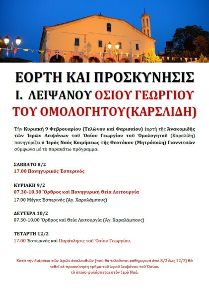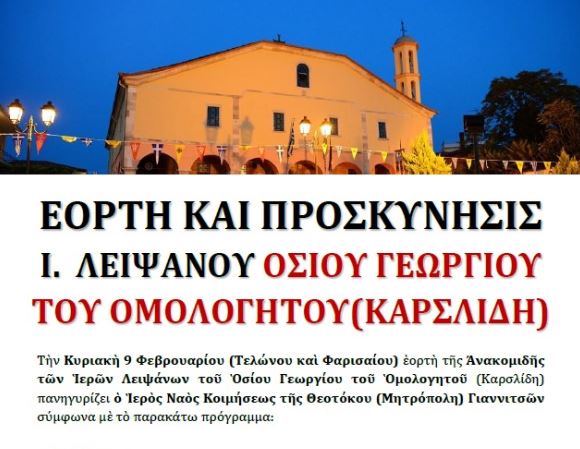 Την Κυριακή 9 Φεβρουαρίου (Τελώνου και Φαρισαίου) εορτή της Ανακομιδής των Ιερών Λειψάνων του Οσίου Γεωργίου του Ομολογητού (Καρσλίδη) πανηγυρίζει ο Ιερός Ναός Κοιμήσεως της Θεοτόκου (Μητρόπολη) Γιαννιτσών, σύμφωνα με το παρακάτω πρόγραμμα:
