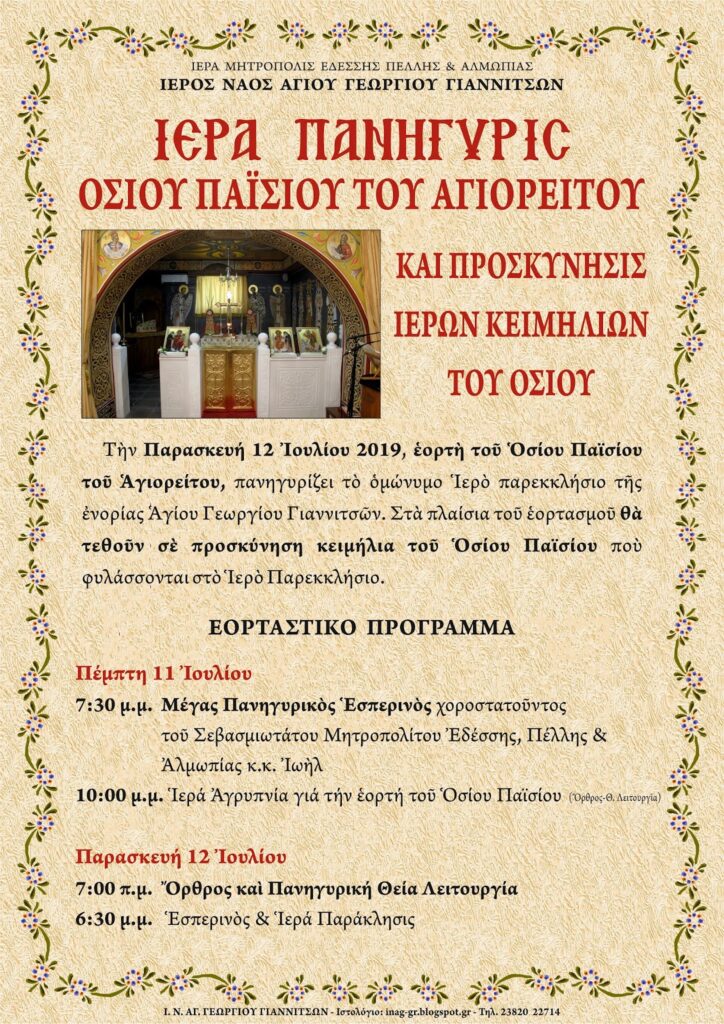 Την Παρασκευή 12 Ιουλίου, εορτή του Οσίου Παϊσίου του Αγιορείτου, πανηγυρίζει το ομώνυμο Ιερό παρεκκλήσιο της ενορίας Αγίου Γεωργίου Γιαννιτσών. Στα πλαίσια του εορτασμού θα τεθούν σε προσκύνηση κειμήλια του Οσίου Παϊσίου τα οποία φυλάσσονται στο Ιερό Παρεκκλήσιο.