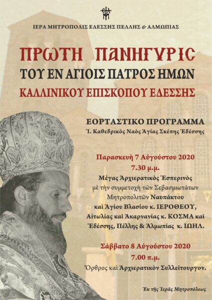Η Ιερά Μητρόπολις Εδέσσης, Πέλλης και Αλμωπίας ανακοινώνει ότι ο πρώτος πανηγυρικός εορτασμός της ιεράς μνήμης του Αγίου Καλλινίκου Μητροπολίτου Εδέσσης, Πέλλης και Αλμωπίας θα πραγματοποιηθεί στις 7 και 8 Αυγούστου 2020 στον Ιερό Καθεδρικό Ναό Αγίας Σκέπης Εδέσσης με την συμμετοχή των Σεβασμιωτάτων Μητροπολιτών Ναυπάκτου και Αγίου Βλασίου κ. Ιεροθέου, Αιτωλίας και Ακαρνανίας κ. Κοσμά και του οικείου Μητροπολίτου κ. Ιωήλ καθώς και του ιερού κλήρου της Ι. Μητροπόλεως σύμφωνα με το εξής πρόγραμμα: