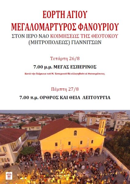 Την Πέμπτη 27 Αυγούστου εορτάζει ο ιστορικός ιερός ναός Κοιμήσεως της Θεοτόκου (Μητρόπολη) Γιαννιτσών επί τη μνήμη του αγίου και ενδόξου Μεγαλομάρτυρος Φανουρίου σύμφωνα με το εξής πρόγραμμα: