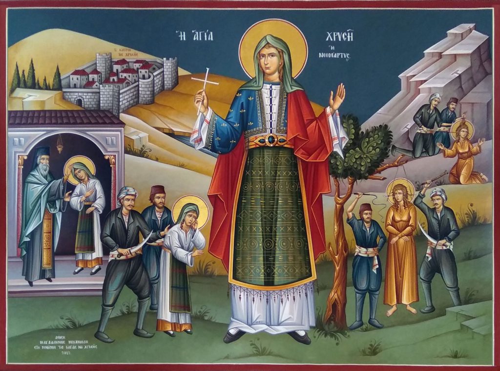Την Τετάρτη, λοιπόν, μνήμη της αγίας και ενδόξου νεομάρτυρος Χρυσής της εν Αλμωπία μαρτυρησάσης, πανηγυρίζει ο αφιερωμένος στην ιερά μνήμη της Ιερός Ναός Αγίας Χρυσής στο χωριό Χρυσή Αλμωπίας, τον τόπο καταγωγής και του μαρτυρίου της.