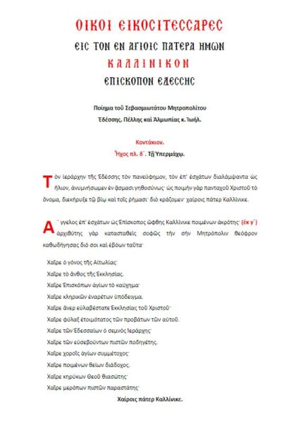 Ο Σεβ. Μητροπολίτης Εδέσσης, Πέλλης και Αλμωπίας κ. Ιωήλ συνέθεσε Ιερά Ακολουθία, Παρακλητικό Κανόνα, Χαιρετισμούς και Εγκώμια εις τον νέον της Εκκλησίας μας, Άγιον Καλλίνικον Μητροπολίτην Εδέσσης, Πέλλης και Αλμωπίας.