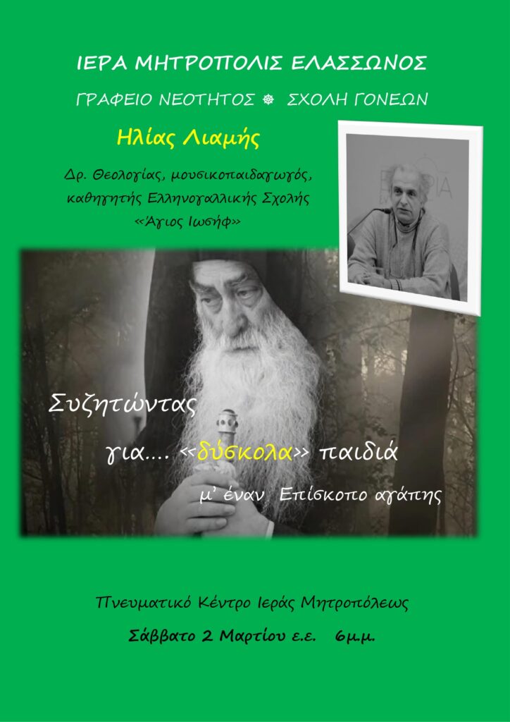 Η Ιερά Μητρόπολή Ελασσώνος θα υποδεχθεί τον Καθηγητή κ. Ηλία Λιαμή στην 5η συνάντηση της Σχολής Γονέων σήμερα, Σάββατο 2 Μαρτίου 2024 στις 6:00μ.μ.