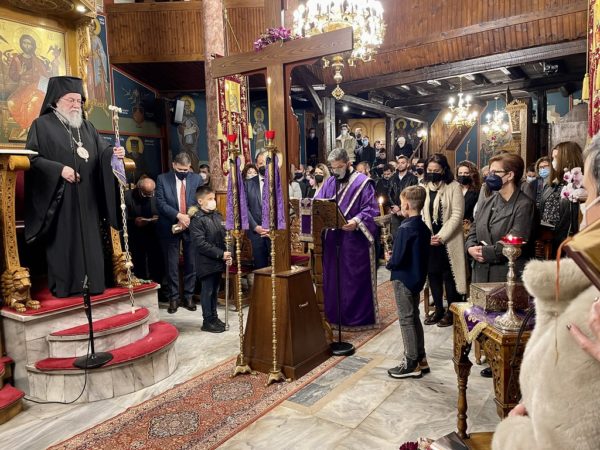 Μετά την ανάγνωση του πέμπτου Ευαγγελίου εξήλθε μέσα σε κατανυκτική ατμόσφαιρα του ιστορικού Ναού της πόλεως ο Εσταυρωμένος και στερεώθηκε στο μέσο του Ναού προς προσκύνηση από τις εκατοντάδες πιστών χριστιανών που είχαν κατακλύσει το ναό και τον περίβολο του τηρώντας τα μέτρα κατά της πανδημίας, ενώ έψαλλαν μελωδικώς τους θεσπέσιους ύμνους της ακολουθίας ο Πρωτοψάλτης του Μητροπολιτικού Ναού κ. Χρυσοβαλάντης Ιωαννίδης μετά της χορωδίας του.