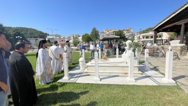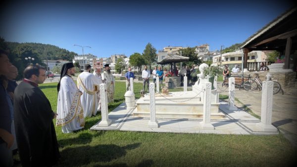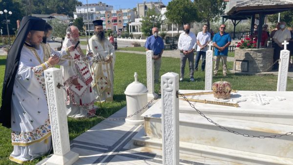 Τέλος ο Σεβασμιώτατος με τους ιερείς και τους πιστούς μετέβησαν στο προαύλιο του Μητροπολιτικού Ναού όπου ευρίσκεται το μνήμα του Μακαριστού Μητροπολίτου Ελευθερουπόλεως κυρού Ευδοκίμου και ετέλεσε τρισάγιο.