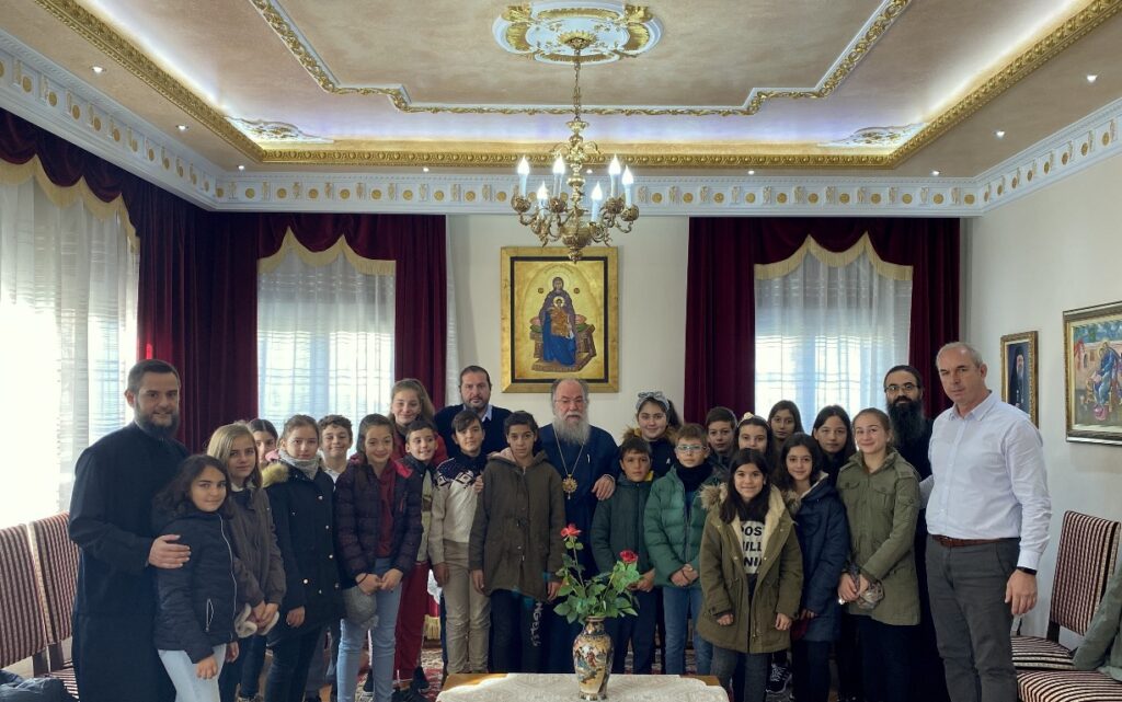Τέλος ο Σεβασμιώτατος έδωσε ως ευλογία στους μικρούς επισκέπτες του μια επιτραπέζια εικονίτσα της Παναγίας και ένα κομποσκοίνι.