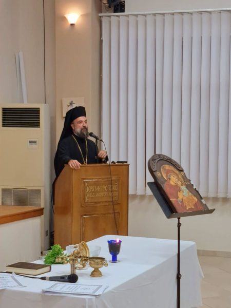 Στο σύντομο χαιρετισμό του ο Σεβασμιώτατος ευχήθηκε καλή πρόοδο στους σπουδαστές της σχολής, εξήρε τη σημασία της εκμάθησης της θείας τέχνης του ιερού Δαμασκηνού, καθώς δι’ αυτής διακονείται η ευταξία, η ευπρέπεια και η πνευματικώς νοουμένη μεγαλοπρέπεια της λατρείας της αγίας μας Εκκλησίας τονίζοντας πως ο ιεροψάλτης απευθύνοντας “ὕμνους καί ὠδάς πνευματικάς” εκ προσώπου του λαού οφείλει με το εκ Θεού χάρισμα και τη μουσική καλλιέργειά του να συμβάλει στην κατάνυξη και προσευχή των πιστών.