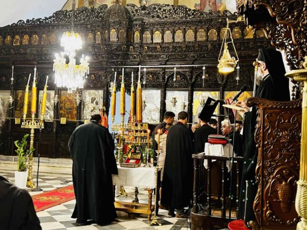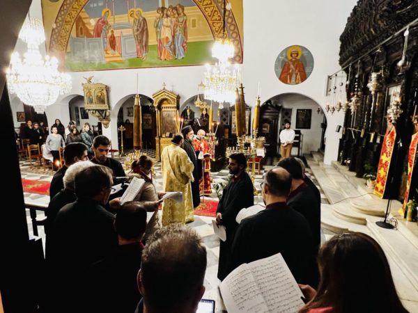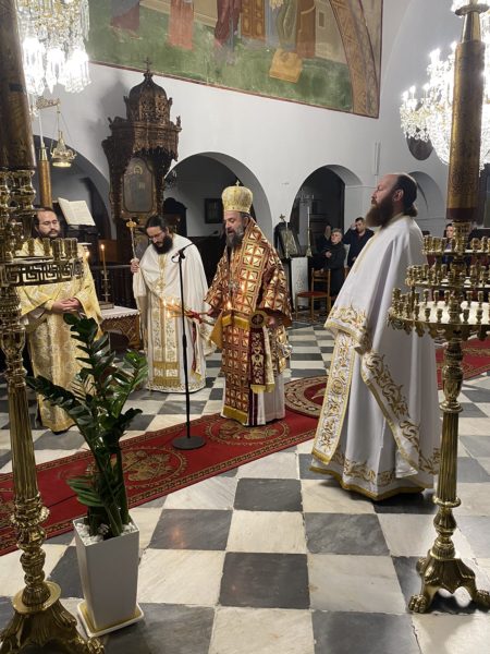 Ενώ το βράδυ της ίδιας ημέρας τελέστηκε Ιερά Αγρυπνία επί τη εορτή των Τριών Ιεραρχών στον Ιερό Ενοριακό Ναό Εισοδίων της Θεοτόκου Ημεροβιγλίου Θήρας, προεξάρχοντος του Σεβασμιωτάτου κ. Αμφιλοχίου, στην οποία και αναγνώσθηκε το Μήνυμα της Ιεράς Συνόδου για την εορτή των Τριών Ιεραρχών. Το αναλόγιο διακόνησαν σπουδαστές της Σχολή Βυζαντινής Μουσικής Ιεράς Μητροπόλεως Θήρας υπό τη χοραρχία του διευθυντού αυτής κ. Ευτυχίου Μαρκοζάννε.
