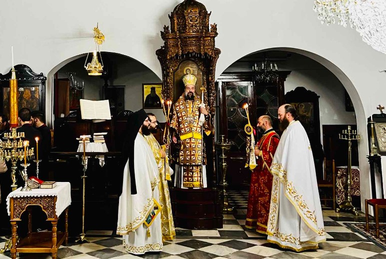 Ενώ το βράδυ της ίδιας ημέρας τελέστηκε Ιερά Αγρυπνία επί τη εορτή των Τριών Ιεραρχών στον Ιερό Ενοριακό Ναό Εισοδίων της Θεοτόκου Ημεροβιγλίου Θήρας, προεξάρχοντος του Σεβασμιωτάτου κ. Αμφιλοχίου, στην οποία και αναγνώσθηκε το Μήνυμα της Ιεράς Συνόδου για την εορτή των Τριών Ιεραρχών. Το αναλόγιο διακόνησαν σπουδαστές της Σχολή Βυζαντινής Μουσικής Ιεράς Μητροπόλεως Θήρας υπό τη χοραρχία του διευθυντού αυτής κ. Ευτυχίου Μαρκοζάννε.