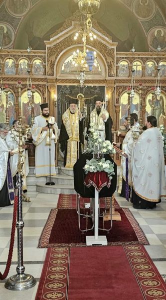 Το πρωί της ημέρας στον Ιερό Ενοριακό Ναό Ευαγγελισμού της Θεοτόκου Εμπορείου Θήρας τελέστηκε ενώπιον του σκηνώματος του αοιδίμου πρεσβυτέρου η Θεία Λειτουργία και στη συνέχεια προεξάρχοντος του Σεβασμιωτάτου Μητροπολίτου Σύρου κ. Δωροθέου Β’ και συγχοροστατούντος του Σεβασμιωτάτου Μητροπολίτου Θήρας κ. Αμφιλοχίου τελέσθηκε η εξόδιος ακολουθία με τη συμμετοχή κληρικών της νήσου.