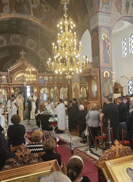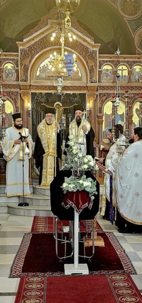 Το πρωί της ημέρας στον Ιερό Ενοριακό Ναό Ευαγγελισμού της Θεοτόκου Εμπορείου Θήρας τελέστηκε ενώπιον του σκηνώματος του αοιδίμου πρεσβυτέρου η Θεία Λειτουργία και στη συνέχεια προεξάρχοντος του Σεβασμιωτάτου Μητροπολίτου Σύρου κ. Δωροθέου Β’ και συγχοροστατούντος του Σεβασμιωτάτου Μητροπολίτου Θήρας κ. Αμφιλοχίου τελέσθηκε η εξόδιος ακολουθία με τη συμμετοχή κληρικών της νήσου.