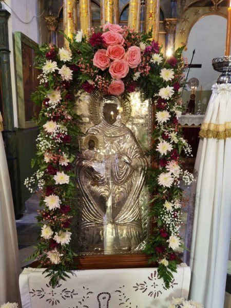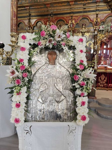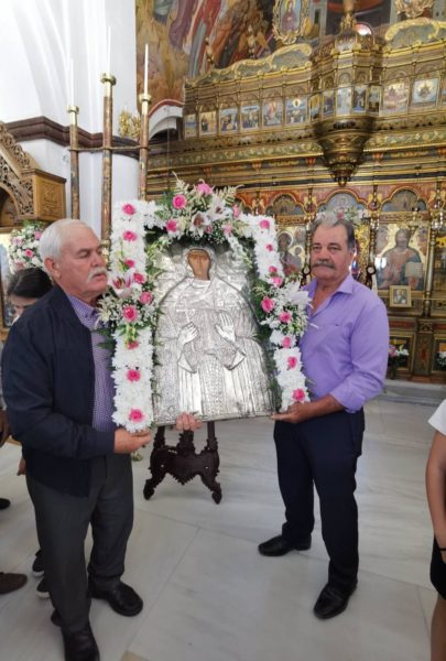 Μετά το πέρας της Αρχιερατικής Θείας Λειτουργίας ευλογήθηκε η παραδοσιακή πανήγυρις και ακολούθησε περιφορά της Ιεράς Εικόνας της Αγίας στα γραφικά σοκάκια του χωριού.