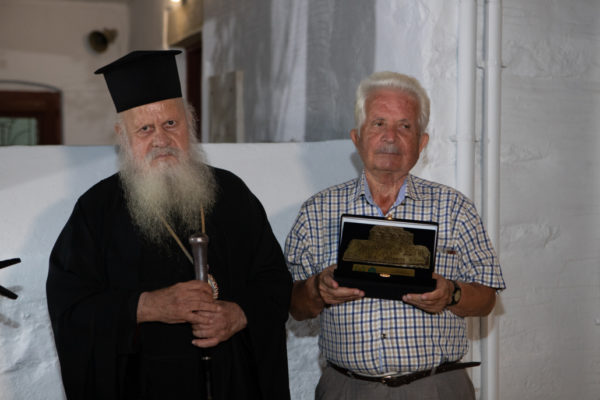Κλείνοντας την εκδήλωση ο Δήμαρχος Αμοργού Λευτέρης Καραΐσκος ευχαρίστησε όλους και όλες που έδωσαν το παρόν αλλά και όσους λόγω ανειλημμένων υποχρεώσεων «δεν κατάφεραν να είναι εδώ αλλά η σκέψη τους είναι μαζί μας» όπως είπε χαρακτηριστικά και απένειμε τιμητική πλακέτα στον Σεβασμιότατο Μητροπολίτη Θήρας Αμοργού & Νήσων κ.κ. Επιφάνιο Αρτέμη για την δεκαετιών πολύτιμη πνευματική και εκπαιδευτική προσφορά του και την υποστήριξη της μαθητικής νεολαίας της Αμοργού ως Διευθυντής του Μαθητικού Οικοτροφείου της Σαντορίνης.