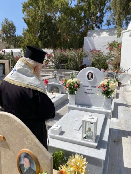 Κατόπιν, ο Σεβασμιώτατος μετέβη στο κοιμητήριο του Εμπορείου, όπου τέλεσε τρισάγιο εις μνήμην του μακαριστού Νικόλαου Λαδικού (διδασκάλου και επί πολλά έτη εκκλησιαστικού συμβούλου του ενοριακού ναού Ευαγγελισμού της Θεοτόκου Εμπορείου Σαντορίνης) επί τη συμπληρώσει 40 ημερών από την κοίμησή του.