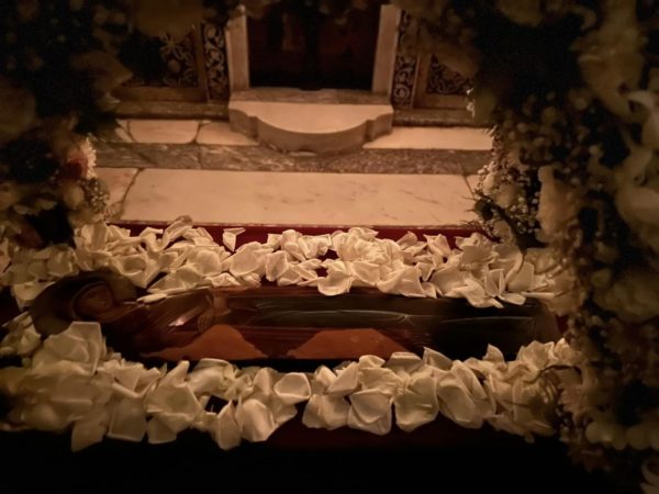 Με κατάνυξη ψάλθηκε χυες 13 Αυγούστου 2024 η ακολουθία του Εσπερινού, της Μεγάλης Παράκλησης προς την Υπεραγία Θεοτόκο και των εγκώμια της Υπεραγίας Θεοτόκου μπροστά στον επιτάφιό της, στον Ιερό Προσκυνηματικό Ναό Παναγίας της Επισκοπής στην Μέσα Γωνιά της Σαντορίνης χοροσταντούντος του Σεβασμιωτάτου Μητροπολίτου Θήρας, Αμοργού και Νήσων κ. Αμφιλοχίου, με τη συμμετοχή πλήθους πιστών.