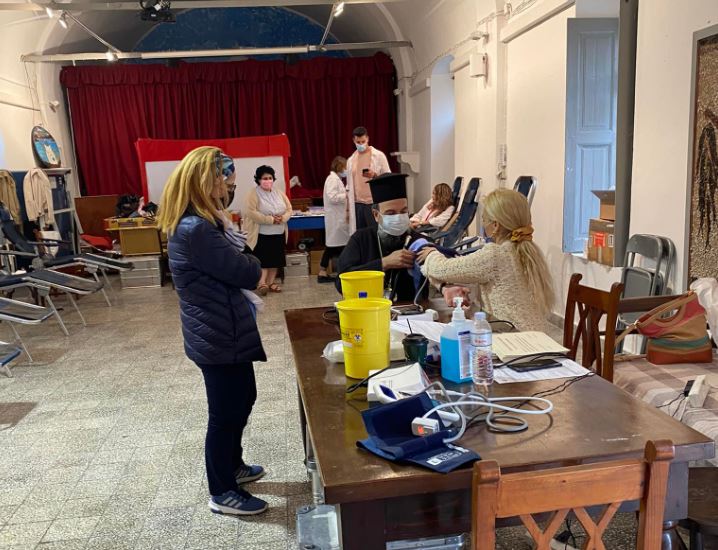 Ο Μητροπολίτης Θήρας κ. Αμφιλόχιος επισκέφθηκε σήμερα το πρωί το συνεργείο αιμοδοσίας στην Οία προκειμένου να ευχηθεί στο νοσηλευτικό προσωπικό.