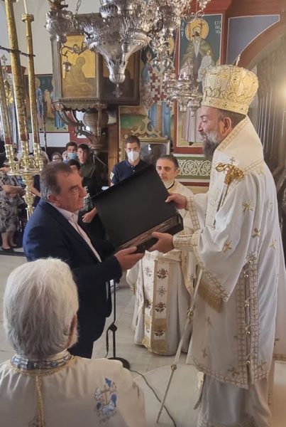 Μετά το πέρας της Θείας Λειτουργίας ο Γενικός Αρχιερατικός Επίτροπος της Ιεράς Μητροπόλεως, αιδεσιμολ. πρωτοπρεσβύτερος π. Νικόλαος Σιγάλας, κόποις τε και μόχθοις του οποίου πραγματοποιήθηκε η ανακαίνιση του Ιερού Ναού, ευχαρίστησε τους δωρητές που συνέβαλαν τα μέγιστα στο έργο, μεταξύ των οποίων την Εφορεία Αρχαιοτήτων Κυκλάδων (Τμήμα Βυζαντινών και Μεταβυζαντινών Αρχαιοτήτων) για την αγαστή συνεργασία, το Δήμαρχο Θήρας κ. Αντώνιο Σιγάλα, τον Επιχειρηματία κ. Αντώνιο Ηλιόπουλο και τους κ.κ. Αντώνιο Χάλαρη και Εμμανουήλ Σιγάλα, στους οποίους ο Σεβασμιώτατος προσέφερε την εικόνα των Εισοδίων της Κυρίας Θεοτόκου.