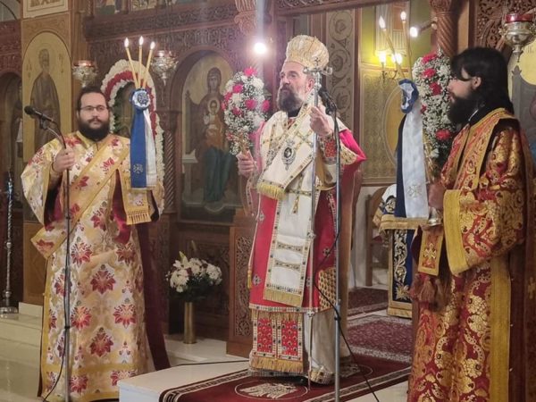 Κατά τον Μέγα Τρισαρχιερατικό Εσπερινό χοροστάτησε ο εκ Θράκης προσελθών Σεβασμιώτατος Μαρωνείας και Κομοτηνής κ. Παντελεήμων, ο οποίος εκήρυξε τον θείο λόγο και ευλόγησε τους προσκομισθέντες άρτους της πανηγύρεως.