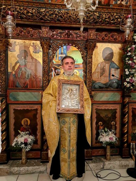 Πλήθη πιστών κατέκλεισαν τον Ιερό Ναό για να προσκυνήσουν την ιερά εικόνα και την ιερά εμβάδα του Αγίου που λιτανεύθηκαν αμέσως μετά το πέρας της Θείας Λειτουργίας και της ευλογήσεως των προσφερθέντων εδεσμάτων.