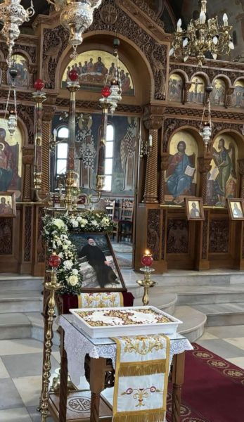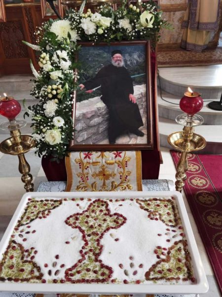 Μετά το πέρας του ιερού μνημοσύνου -στο οποίο παρέστησαν συμπροσευχόμενοι συγγενείς και πνευματικά τέκνα του Γέροντος- τελέστηκε τρισάγιο επί του τάφου του, ευρισκομένου όπισθεν του Ιερού Βήματος του Ιερού Ναού.
