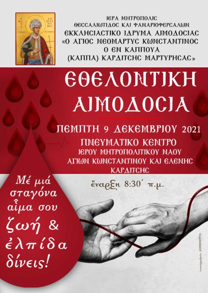 Με σύνθημα “Με μια σταγόνα αίμα σου ζωή και ελπίδα δίνεις!” η Μητρόπολη Θεσσαλιώτιδος και Φαναριοφερσάλων διοργανώνει εθελοντική αιμοδοσία στο Πνευματικό Κέντρο του Ιερού Μητροπολιτικού Ναού Αγίων Κωνσταντίνου και Ελένης Καρδίτσης, την Πέμπτη, 9 Δεκεμβρίου.